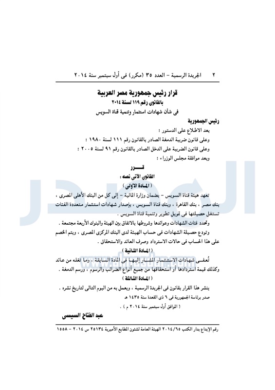 نشرت "الجريدة الرسمية "قرار رئيس الجمهورية بشأن شهادات استثمار وتنمية قناة السويس، نص في مادته الأولى على ما يلي:- "تعهد هيئة قناة السويس – بضمان وزارة المالية – إلى كل من البنك الأهلي المصري، وبنك مصر، وبنك القاهرة، وبنك قناة السويس، بإصدار شهادات استثمار متعددة الفئات تستغل حصيلتها في تمويل تطوير وتنمية قناة السويس وتحدد فئات الشهادات وعوائدها وشروطها بالاتفاق بين الهيئة والبنوك الأربعة ال