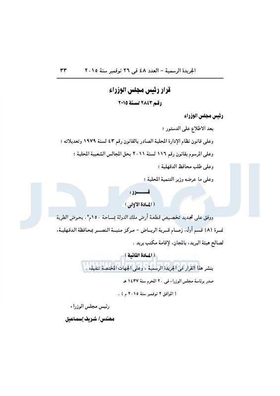 - القرار 2843 لسنة 2015، بشأن الموافقة على تجديد تخصيص قطعة أرض ملك الدولة بمساحة 150 متر مربع، لصالح هيئة البريد بالمجان.