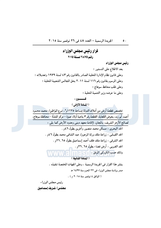 - القرار رقم 2875 لسنة 2015 ، بتخصيص قطعة أرض بمساحة 1225 متر مربع، بمحافظة السوهاج، لصالح الأزهر الشريف، بالمجان.