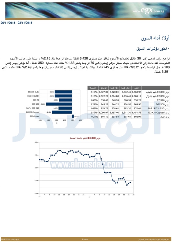 أظهر التقرير الأسبوعي للبورصة المصرية تراجع أداء مؤشرات السوق الرئيسية والثانوية ، حيث إنخفض المؤشر الرئيسي للبورصة المصرية "إيجي اكس 30" بنسبة 2,15 % ليصل إلى مستوى 6428 نقطة.
