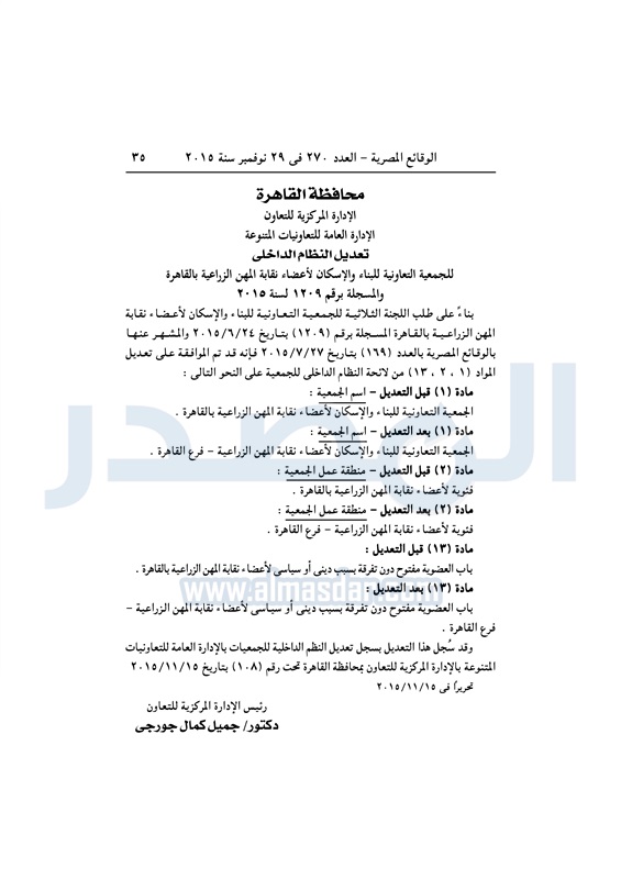 نشرت الوقائع المصرية فى العدد رقم 270 الصادر فى 29 نوفمبر 2015، قرار الإدارة العامة للتعاونيات المتنوعة بمحافظة القاهرة، بشأن تعديل النظام الداخلي، للجمعية التعاونية للبناء والإسكان لأعضاء نقابة المهن الزراعية بالقاهرة .
