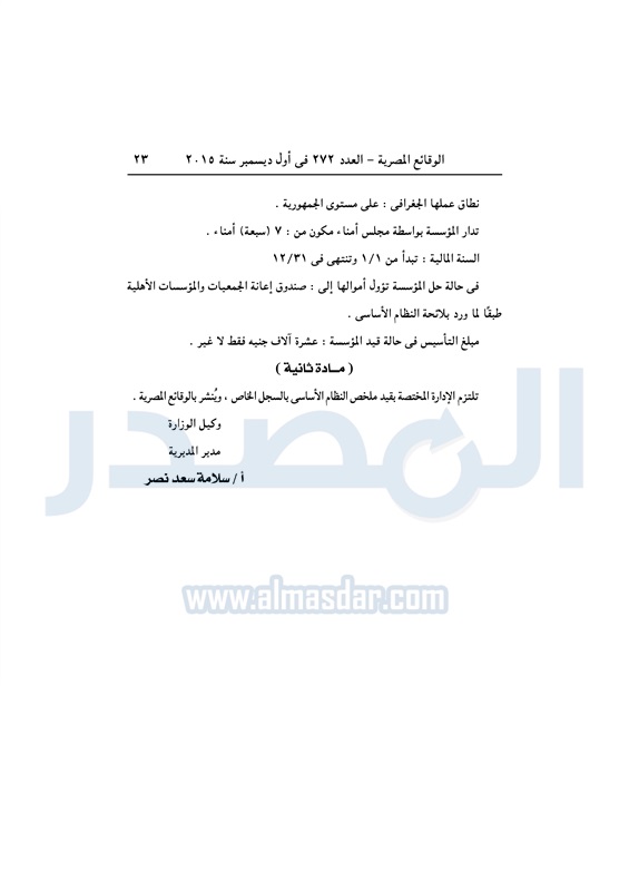 نشرت الوقائع المصرية فى العدد رقم 272 ، الصادر فى أول ديسمبر 2015 ، قرار مديريرة التضامن الاجتماعى بمحافظة القاهرة رقم 9978 لسنة 2015 ، بشأن قيد مؤسسة أبناء الريانية المعلق للمساعدات الاجتماعية، التابعة لإدارة مصر القديمة الاجتماعية.