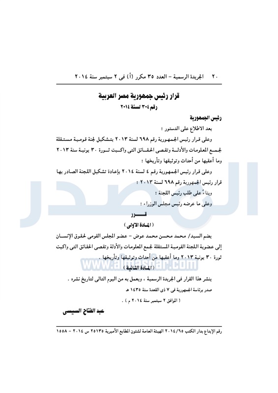 "الجريدة الرسمية":قرار جمهوري بضم عضوالمجلس القومى لحقوق الإنسان للجنة تقصى حقائق 30 يونية والى نص القرار :