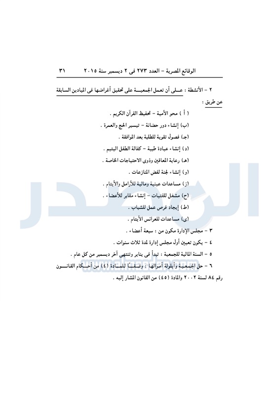 نشرت الوقائع المصرية فى العدد رقم 273 ، الصادر فى 2 ديسمبر 2015 ، قرارات مديرية التضامن الاجتماعى بمحافظة القليوبية ، بشأن قيد ملخص النظام الأساسى لجمعية أبناء وادى النيل للخدمات الاجتماعية والتنمية بمديرية التضامن الاجتماعى بالقليوبية ، وتعديل ملخص النظام الاساسى لجمعية البدر الخيرية بمسطرد بمديرية التضامن الاجتماعى بالقليوبية .