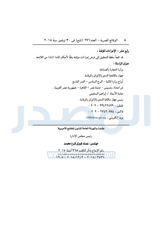 نشرت الوقائع المصرية فى العدد رقم 271 تابع، الصادر فى 30 نوفمبر لسنة 2015، إعلان جهاز مكافحة الدعم والإغراق والوقاية التابع لوزارة التجارة والصناعة، رقم 11 لسنة 2015، بشأن بدء إجراءات تحقيق مكافحة الإغراق ضد الواردات من صنف "أورثوفثالات ثنائي أوكتيل" ذات المنشأ أو المصدرة من كوريا الجنوبية.