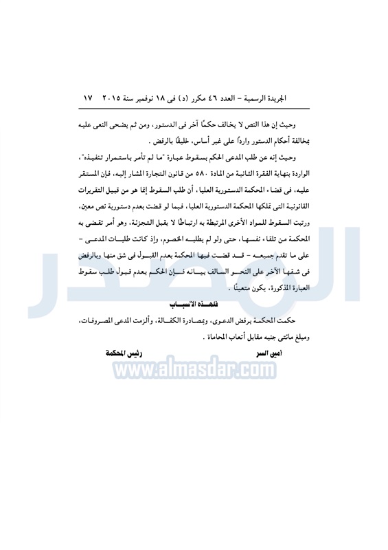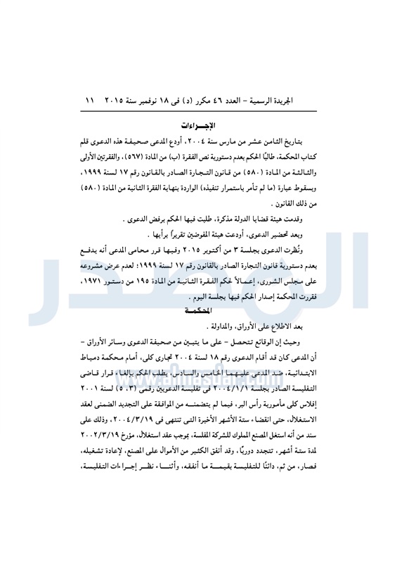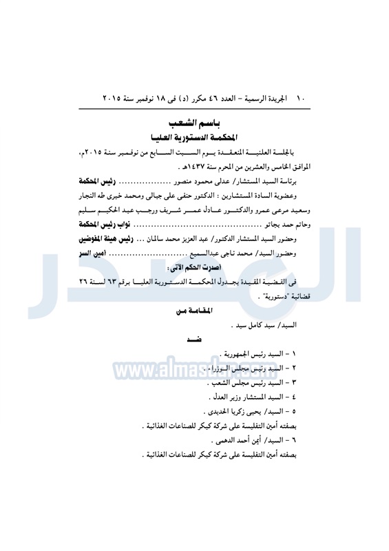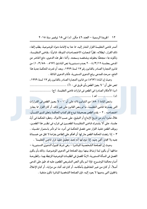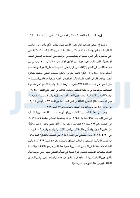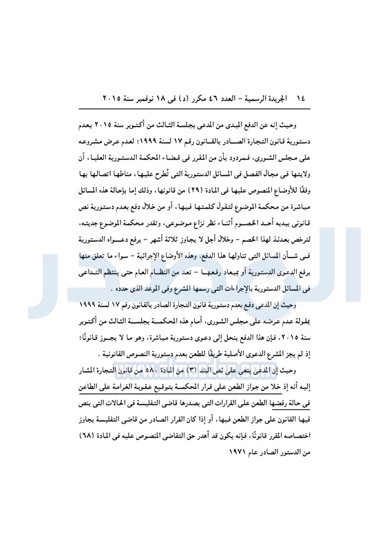 أخبار مصر "الدستورية" تؤكد صحة الفقرة "ب" من المادة 576 بقانون التجارة الثلاثاء 08 ديسمبر 2015 - 03:23 م 12/8/2015 3:23:41 PM صورة أرشيفية المصدر - خاص طباعة شارك نشرت الجريدة الرسمية في العدد رقم 46 مكرر "د"، الصادر بتاريخ 18 نوفمبر 2015،حكم المحكمة الدستورية العليا، في القضية رقم 63 لسنة 26 قضائية "دستورية".لقراءة الحكم : طباعة شارك الجريدة الرسمية 2015 تابع المصدر علي جوجل نيوز تطبيق نبض