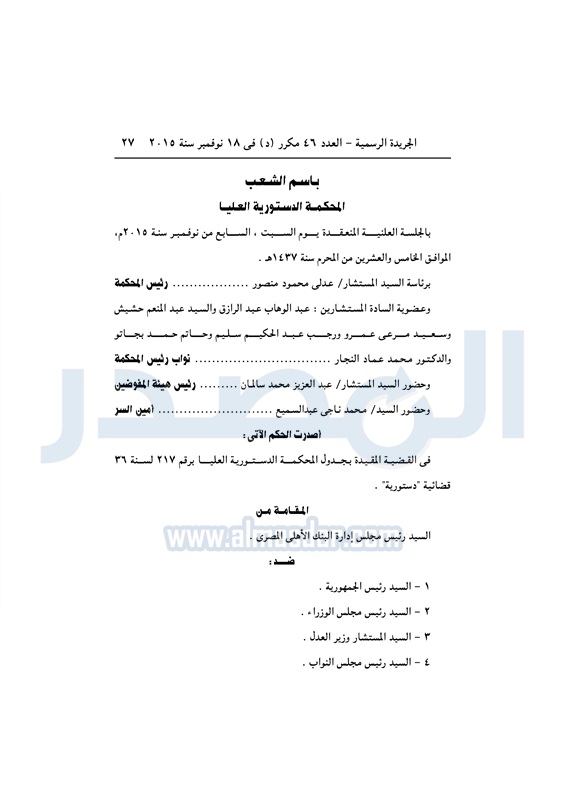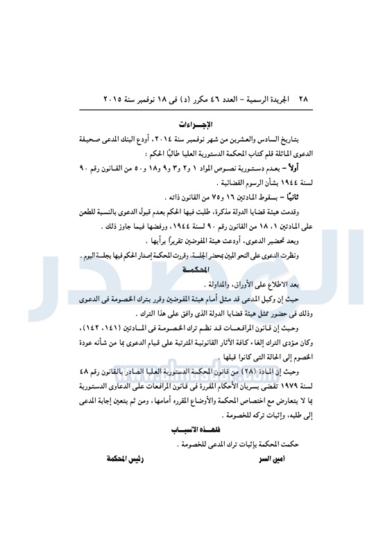 بنوك "الدستورية" تفصل في دعوى البنك الأهلى بشأن قانون الرسوم القضائية الثلاثاء 08 ديسمبر 2015 - 03:41 م 12/8/2015 3:41:00 PM صورة أرشيفية المصدر - خاص طباعة شارك نشرت الجريدة الرسمية في العدد رقم 46 مكرر "د"، الصادر بتاريخ 18 نوفمبر 2015،حكم المحكمة الدستورية العليا، في القضية رقم 217 لسنة 36 قضائية "دستورية".لقراءة الحكم : طباعة شارك الجريدة الرسمية 2015 تابع المصدر علي جوجل نيوز تطبيق نبض