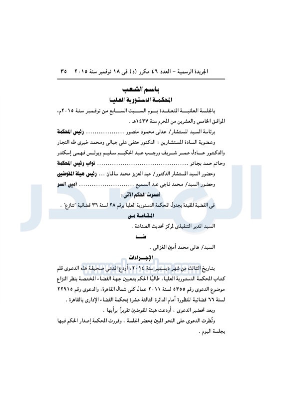 أخبار مصر "الدستورية" تقضي برفض دعوى المدير التنفيذي لمركز تحديث الصناعة الثلاثاء 08 ديسمبر 2015 - 03:46 م 12/8/2015 3:46:25 PM صورة أرشيفية المصدر - خاص طباعة شارك نشرت الجريدة الرسمية في العدد رقم 46 مكرر "د"، الصادر بتاريخ 18 نوفمبر 2015،حكم المحكمة الدستورية العليا، في القضية رقم 28 لسنة 36 قضائية "دستورية".لقراءة الحكم : طباعة شارك تابع المصدر علي جوجل نيوز تطبيق نبض