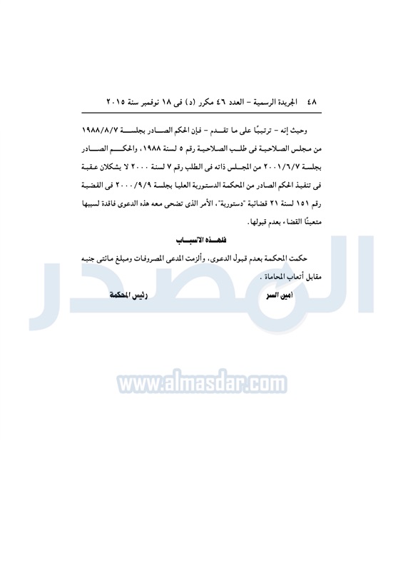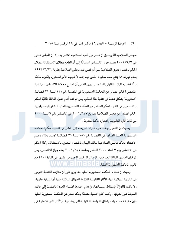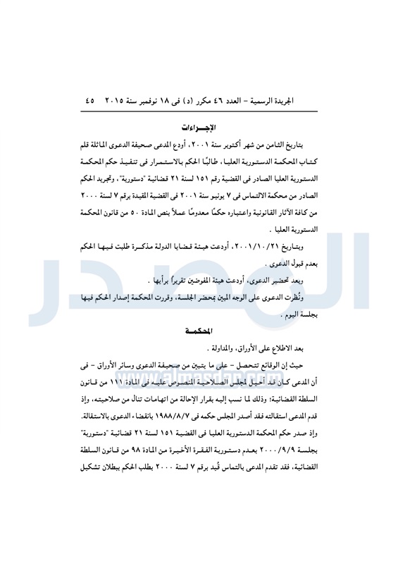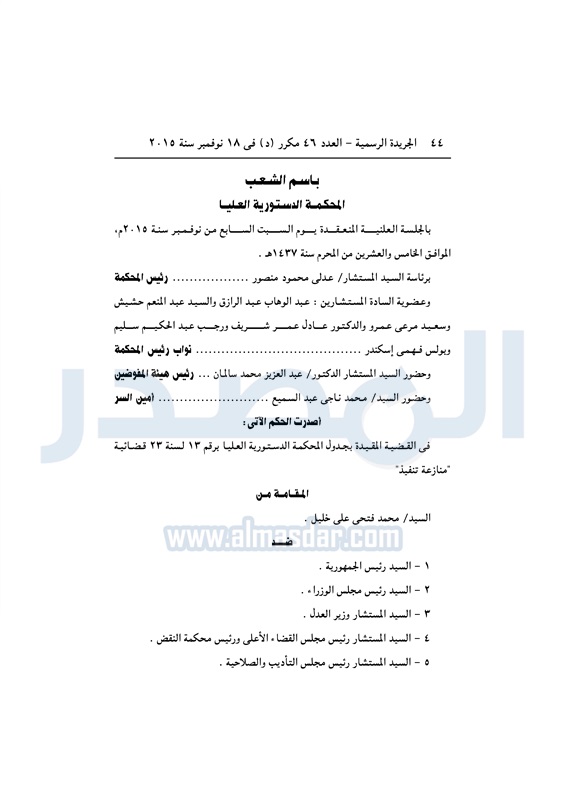 أخبار مصر "الدستورية" ترفض الدعوى رقم 13 لسنة 23 قضائية "منازعة تنفيذ" الثلاثاء 08 ديسمبر 2015 - 03:49 م 12/8/2015 3:49:54 PM عدلي منصور رئيس المحكمة المصدر - خاص طباعة شارك نشرت الجريدة الرسمية في العدد رقم 46 مكرر "د"، الصادر بتاريخ 18 نوفمبر 2015، حكم المحكمة الدستورية العليا، في القضية رقم 13 لسنة 23 قضائية "منازعة تنفيذ".لقراءة الحكم : طباعة شارك الجريدة الرسمية 2015 تابع المصدر علي جوجل نيوز تطبيق نبض