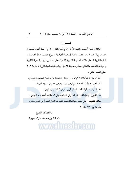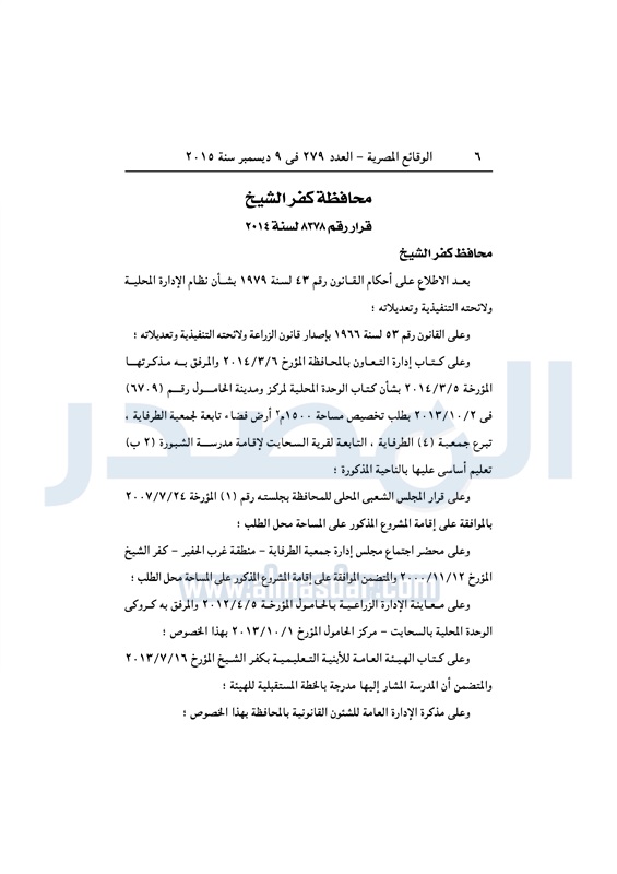 عقارات محافظة كفر الشيخ يخصص قطعة أرض لإقامة مدرسة الأربعاء 09 ديسمبر 2015 - 12:37 م 12/9/2015 12:37:48 PM صورة أرشيفية المصدر - خاص طباعة شارك نشرت الوقائع المصرية فى العدد رقم 279، الصادر فى 9 ديسمبر لسنة 2015، قرار محافظة كفر الشيخ، رقم 8378 لسنة 2014، بشأن تخصيص قطعة أرض بمساحة 1500 متر مربعن لإنشاء مدرسة.لقراءة القرار : طباعة شارك مصر تخصيص قطعه ارض المصريه الارض 2015 تابع المصدر علي جوجل نيوز تطبيق نبض