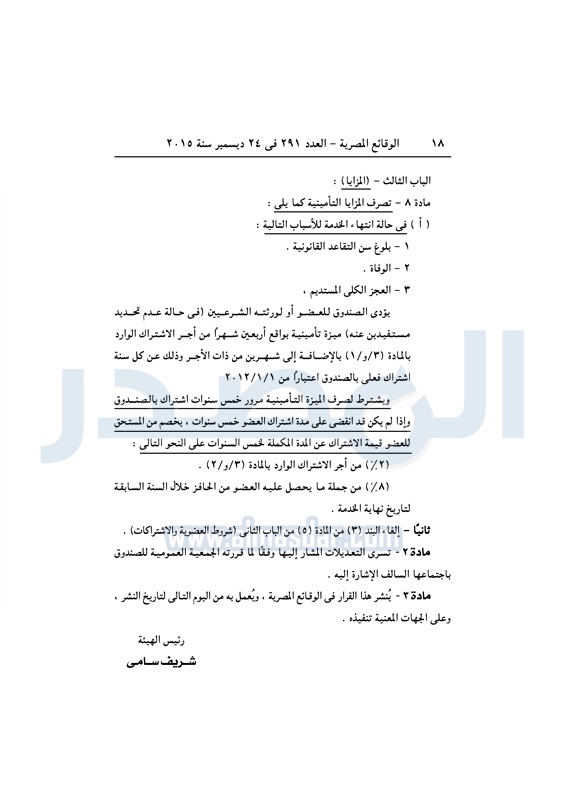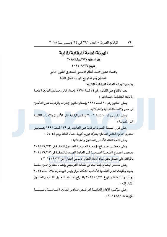 نشرت الوقائع المصرية فى العدد رقم 291، الصادر فى 24 ديسمبر لسنة 2015، قرار الهيئة العامة للرقابة المالية رقم 777 لسنة 2015 ، بشأن تعديل لائحة النظام الأساسي لصندوق التأمين الخاص للعاملين بشركة توزيع كهرباء شمال الدلتا.