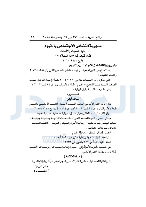 محافظات "التضامن الاجتماعي" تقيد جمعية الصيفية الجديدة الخميس 24 ديسمبر 2015 - 05:11 م 12/24/2015 5:11:55 PM صورة أرشيفية المصدر - خاص طباعة شارك نشرت الوقائع المصرية فى العدد رقم 291، الصادر فى 24 ديسمبر لسنة 2015، قرار مديرية التضامن الاجتماعى بالفيوم بقيد جمعية الصيفية الجديدة لتنمية المجتمع المحلي.لقراءة القرار: طباعة شارك تابع المصدر علي جوجل نيوز تطبيق نبض