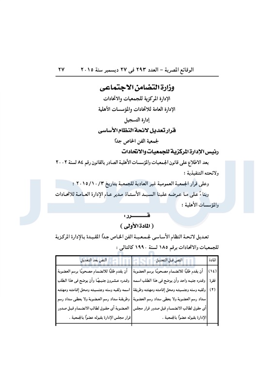 محافظات "التضامن" تقرر تعديل لائحة النظام الأساسي لجمعية "الفن الخاص جدًا" الأحد 27 ديسمبر 2015 - 02:45 م 12/27/2015 2:45:46 PM غادة والي وزيرة التضامن الاجتماعي وكالات طباعة شارك نشرت الوقائع المصرية فى العدد رقم 293، الصادر فى 27 ديسمبر لسنة 2015، قرار وزارة التضامن الاجتماعي، بشأن تعديل لائحة النظام الاساسي لجمعية الفن الخاص جدًا.لقراءة القرار: طباعة شارك وزارة التضامن الاجتماعى مصر ديل المصريه الفن 2015 تابع المصدر علي جوجل نيوز تطبيق نبض