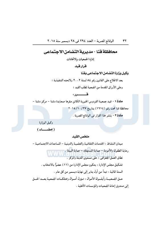 محافظات "التضامن الاجتماعي" بقنا تقرر قيد جمعية الفردوس الخيرية الإثنين 28 ديسمبر 2015 - 03:30 م 12/28/2015 3:30:31 PM غادة والي وزيرة التضامن الاجتماعي المصدر - خاص طباعة شارك نشرت الوقائع المصرية فى العدد رقم 294، الصادر فى 28 ديسمبر لسنة 2015، قرار محافظة قنا مديرية التضامن الاجتماعي، بشأن قيد جمعية الفردوس الخيرية بمركز دشنا.لقراءة القرار: طباعة شارك تابع المصدر علي جوجل نيوز تطبيق نبض