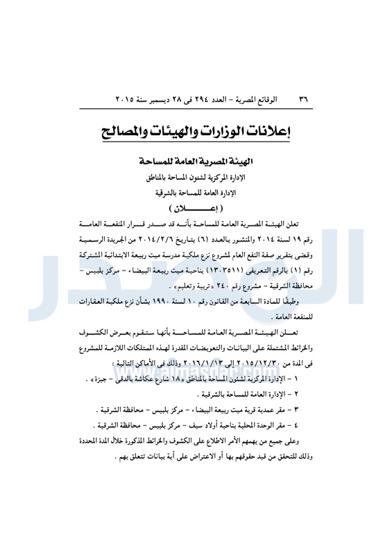 أخبار مصر "هيئة المساحة" تقرر نزع ملكية مدرسة بالشرقية الإثنين 28 ديسمبر 2015 - 04:25 م 12/28/2015 4:25:00 PM صورة أرشيفية المصدر- خاص طباعة شارك نشرت الوقائع المصرية فى العدد رقم 294، الصادر فى 28 ديسمبر لسنة 2015، قرار الهيئة المصرية العامة للمساحة، بشأن نزع ملكية مدرسة ميت ربيعة الإبتدائية المشتركة.لقراءة القرار: طباعة شارك مصر المصريه 2015 تابع المصدر علي جوجل نيوز تطبيق نبض