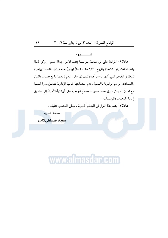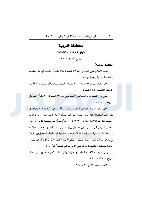 محافظات محافظ الغربية يقرر حل جمعية خير بلدنا بالمحلة الإثنين 04 يناير 2016 - 12:13 م 1/4/2016 12:13:00 PM صورة أرشيفية المصدر- خاص طباعة شارك نشرت الوقائع المصرية فى العدد 3، الصادر فى 4 يناير لسنة 2015، قرار محافظ الغربية رقم 384 لسنة 2015، بشأن حل جمعية خير بلدنا الخيرية بمحلة حسن، مركز المحلة.لقراءة القرار: طباعة شارك مصر الين المصريه التحقيق 2015 تابع المصدر علي جوجل نيوز تطبيق نبض