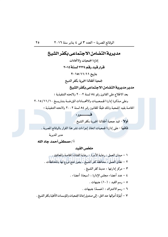 محافظات "التضامن الاجتماعي" بكفر الشيخ تقرر قيد جمعية أطفالنا الخيرية الإثنين 04 يناير 2016 - 12:31 م 1/4/2016 12:31:48 PM صورة أرشيفية المصدر- خاص طباعة شارك نشرت الوقائع المصرية فى العدد 3، الصادر فى 4 يناير لسنة 2015، قرار مديرية التضامن الاجتماعي بكفر الشيخ رقم 2224 لعام 2015، بشأن قيد جمعية أطفالنا الخيرية.لقراءة القرار: طباعة شارك مصر الين المصريه الأطفال 2015 تابع المصدر علي جوجل نيوز تطبيق نبض