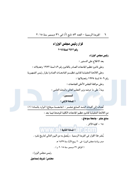 محافظات مجلس الوزراء يعتمد كلية الأثار الجديد بجامعة سوهاج الثلاثاء 05 يناير 2016 - 08:12 م 1/5/2016 8:12:00 PM صورة أرشفية المصدر - خاص طباعة شارك نشرت الجريدة الرسمية فى العدد 53 تابع أ، الصادر فى 31 ديسمبر لسنة 2015، قرار رئيس مجلس الوزراء، رقم 3512 لسنة 2015، بشأن اعتماد كلية الأثار الجديدة بجامعة سوهاج.لقراءة القرار: طباعة شارك تابع المصدر علي جوجل نيوز تطبيق نبض