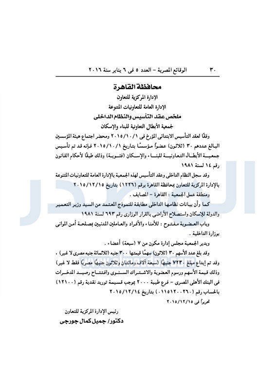 محافظات ملخص عقد التأسيس والنظام الداخلي لجمعية الأبطال التعاونية للبناء والإسكان الأربعاء 06 يناير 2016 - 04:34 م 1/6/2016 4:34:58 PM صورة أرشيفية المصدر - خاص طباعة شارك نشرت الوقائع المصرية فى العدد 5، الصادر فى 6 يناير لسنة 2016، ملخص عقد التأسيس والنظام الداخلي لجمعية الأبطال التعاونية للبناء والإسكان.لقراءة ملخص العقد: طباعة شارك مصر الين المصريه الإسكان تابع المصدر علي جوجل نيوز تطبيق نبض