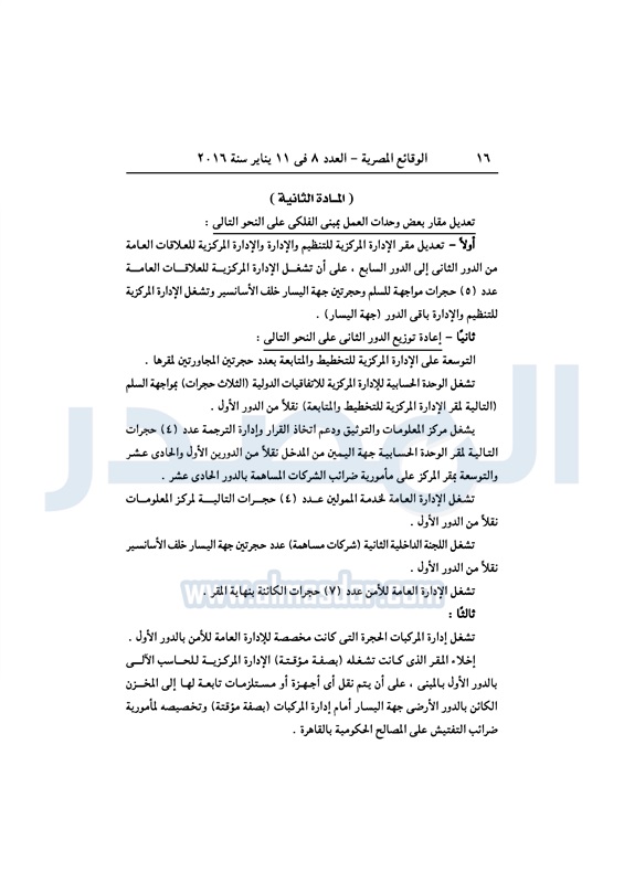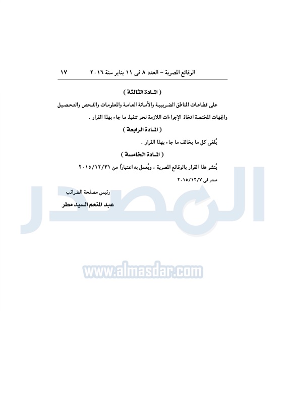 نشرت الوقائع المصرية فى العدد 8، الصادر فى 11 يناير لسنة 2016، قرار مصلحة الضرائب المصرية، رقم 514 لسنة 2015، بشأن تعديل مقر مأمورية ضرائب التفتيش على المصالح الحكومية، والتوسعة على مأمورية ضرائب الإستثمار بالقاهرة.