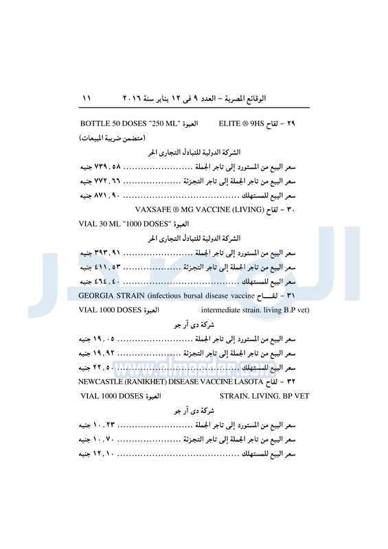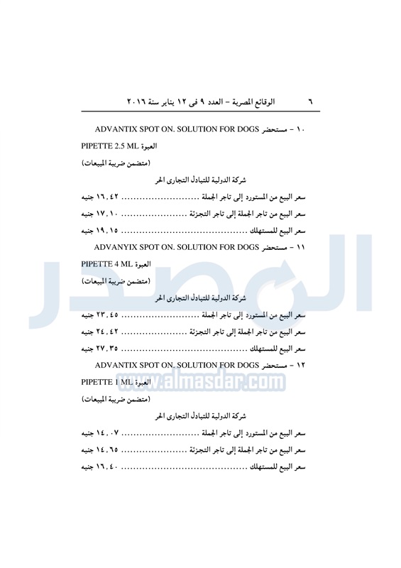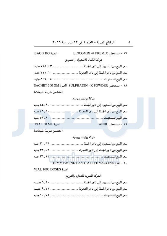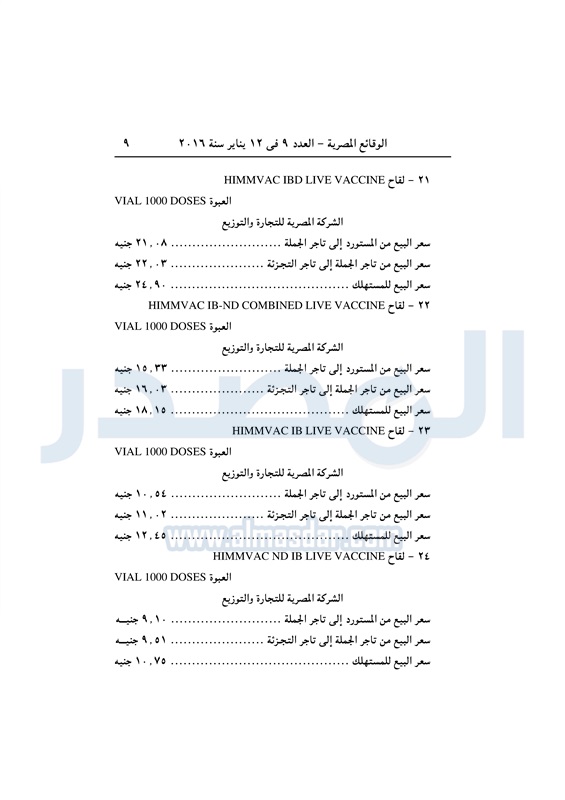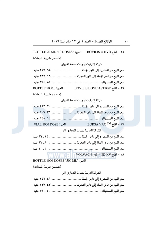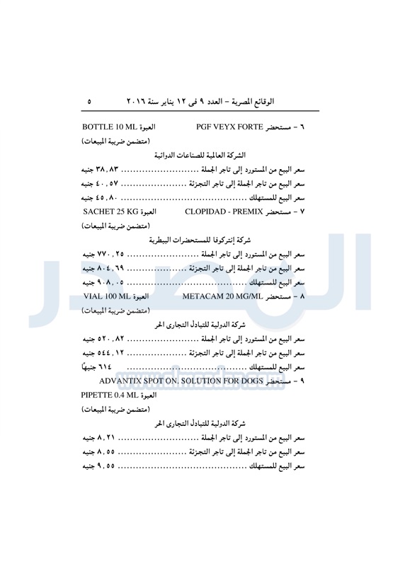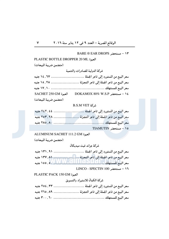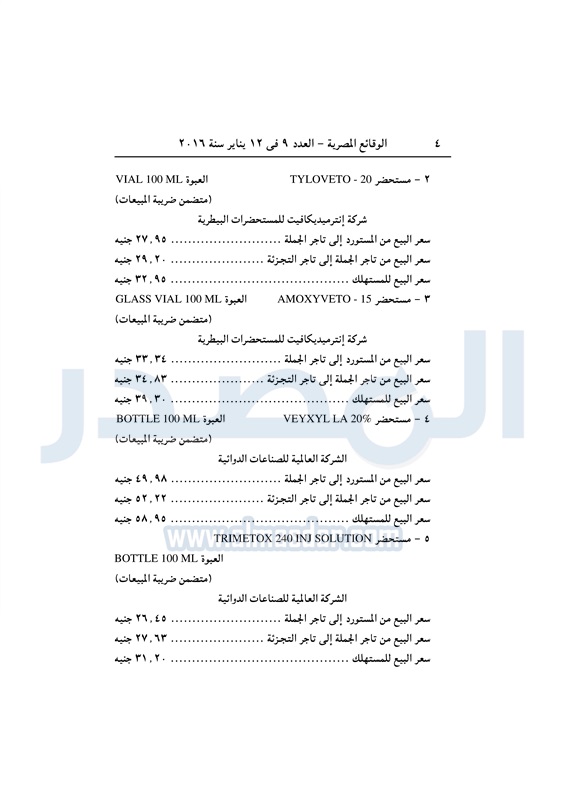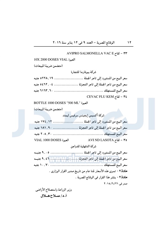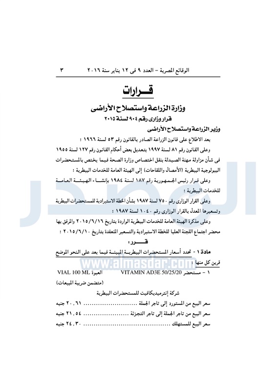 أسواق "الزراعة" تُحدد أسعار المستحضرات البيطرية الثلاثاء 12 يناير 2016 - 10:29 ص 1/12/2016 10:29:04 AM صلاح هلال وزير الزراعة السابق المصدر - خاص طباعة شارك نشرت الوقائع المصرية فى العدد 9، الصادر فى 12 يناير لسنة 2016، قرار وزارة الزراعة واستصلاح الأراضي، رقم 904 لسنة 2015، بشأن تحديد أسعار المستحضرات البيطرية.لقراءة القرار: طباعة شارك وزارة الزراعة مصر المصريه الزراعة الحديد 2015 تابع المصدر علي جوجل نيوز تطبيق نبض