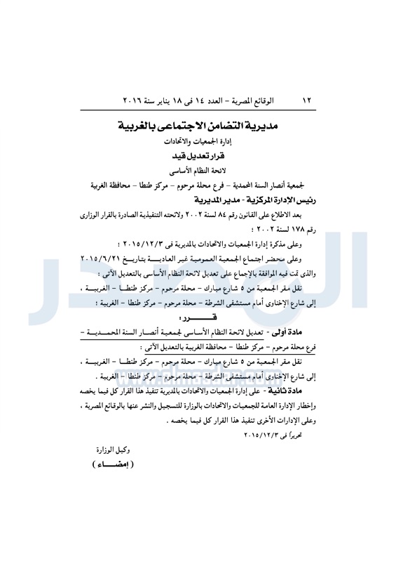 نشرت الوقائع المصرية فى العدد 14، الصادر فى 18 يناير لسنة 2016، قرارات مديرية التضامن بمحافظة الغربية، بشأن تعديل لائحة النظام الأساسي للجمعية الشرعية لتعاون العاملين بالكتاب والسنة وجمعية أنصار السنة المحمدية وحل جمعية الإصلاح والتغيير الإسلامية بزفتى ونهر الكوثر بقحافة.