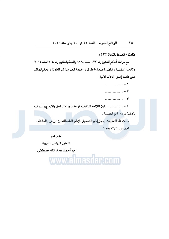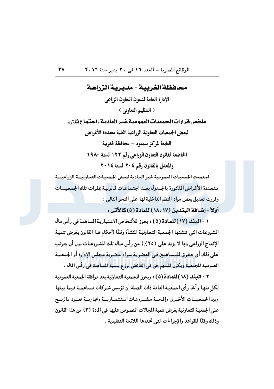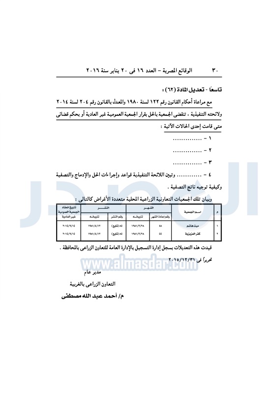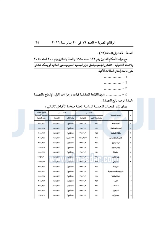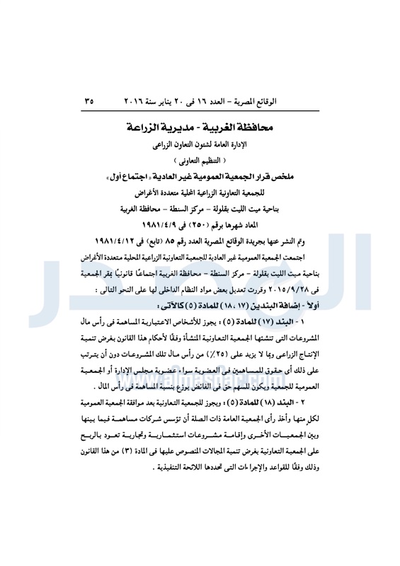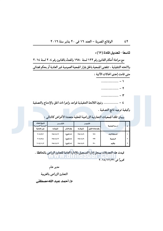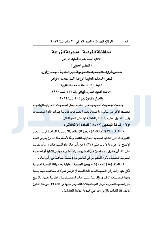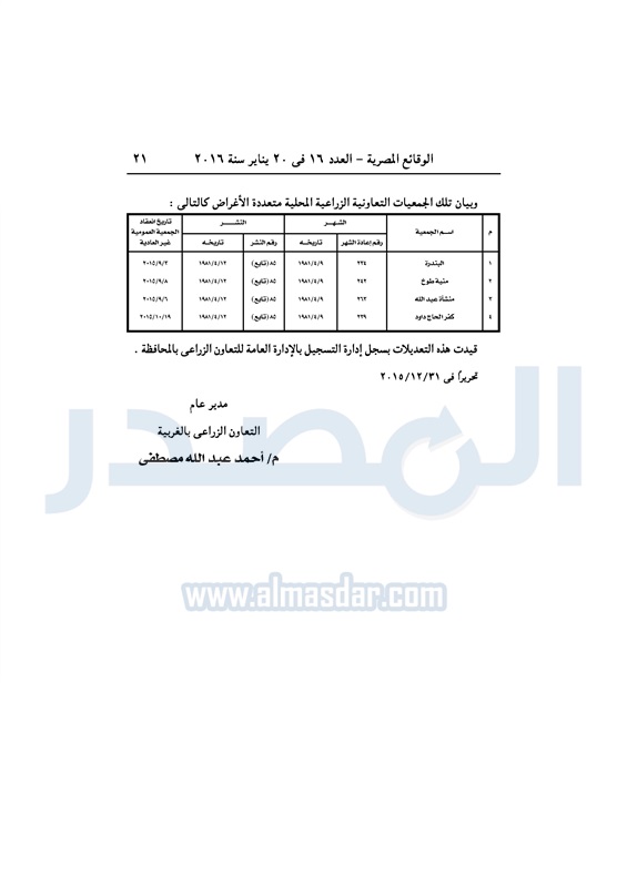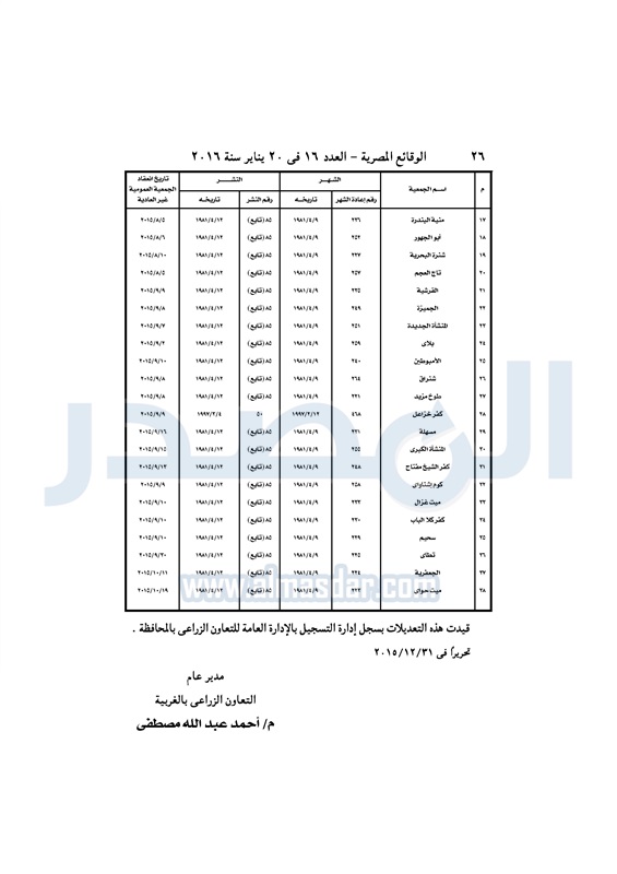 محافظات ملخص قرارات الجمعيات العمومية التابعة لمديرية الزراعة بالغربية الأربعاء 20 يناير 2016 - 01:26 م 1/20/2016 1:26:13 PM ديوان محافظة الغربية - صورة أرشيفية المصدر - خاص طباعة شارك نشرت الوقائع المصرية فى العدد 16، الصادر فى 20 يناير لسنة 2016، ملخص قرارات الجمعيات العمومية غير العادية، التابعة لمديرية الزراعة بالغربية. لقراءة القرارات: طباعة شارك تابع المصدر علي جوجل نيوز تطبيق نبض