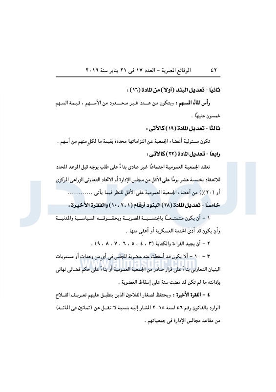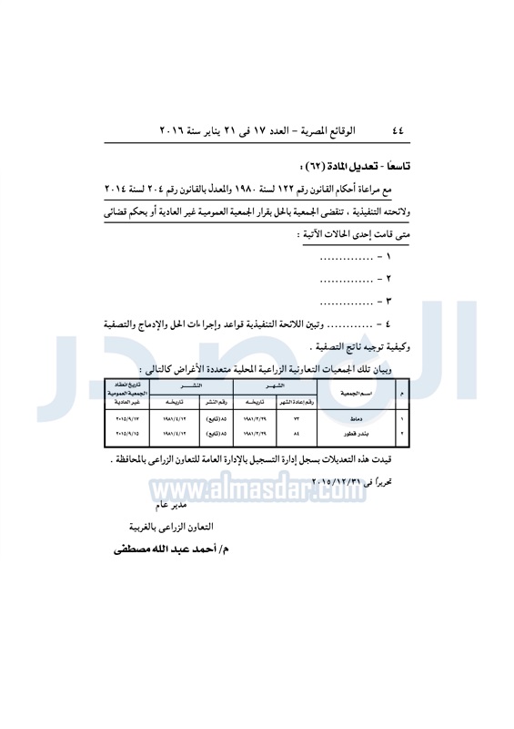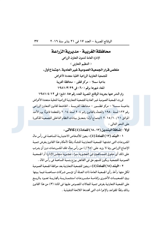 محافظات ملخص قرار الجمعية العمومية غير العادية لـ"الجمعية التعاونية الزراعية" بالغربية الخميس 21 يناير 2016 - 04:25 م 1/21/2016 4:25:29 PM محافطة الغربية - صورة أرشيفية المصدر - خاص طباعة شارك نشرت الوقائع المصرية فى العدد 17، الصادر فى 21 يناير لسنة 2016، قرارات مديرية الزراعة بالغربية، بشأن ملخص قرار الجمعية العمومية غير العادية. لقراءة القرارات: طباعة شارك ملخص قرارات قرار الوقائع المصرية الغربية الزراعة تابع المصدر علي جوجل نيوز تطبيق نبض