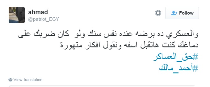 وقال أحد مستخدمي تويتر: "والعسكري دا برضه عنده نفس سنك ولو كان ضربك علي دماغك كنت هتقبل أسفه وتقول أفكار متهورة"، بينما قال مستخدم آخر "لاء دي مش حرية شخصية ولا كبت زى ما هو بيقول خالص .. الحرية الشخصية دى انك متتعرضش لحرية الأخرين وتأذيهم كدا".