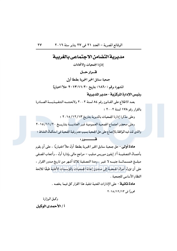 محافظات "التضامن الاجتماعي" بالغربية تقرر حل جمعية خيرية بطنطا الأربعاء 27 يناير 2016 - 12:48 م 1/27/2016 12:48:15 PM محافطة الغربية - صورة أرشيفية المصدر - خاص طباعة شارك نشرت الوقائع المصرية فى العدد 21، الصادر فى 27 يناير لسنة 2016، قرار مديرية التضامن الإجتماعي بمحافظة الغربية، بشأن حل جمعية خيرية بطنطا.لقراءة القرار: طباعة شارك محافظة الغربية طنطا جمعية خيرية الوقائع المصرية الصندوق الاجتماعي تابع المصدر علي جوجل نيوز تطبيق نبض