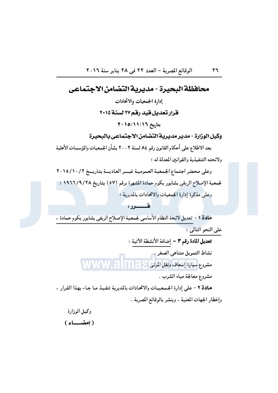نشرت الوقائع المصرية فى العدد رقم 22، الصادر فى 28 يناير لسنة 2016، قراري مديرية التضامن الاجتماعي بالبحيرة، بشأن تعديل لائحة النظام الأساسي لجمعية الاصلاح الريفي، وجمعية تنمية المجتمع.