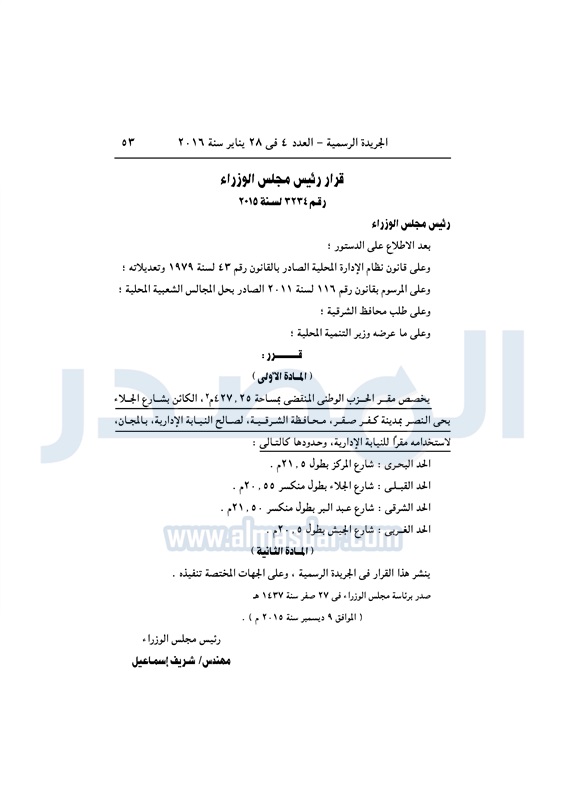 محافظات "الجريدة الرسمية" تنشر قرار تخصيص مقر الحزب الوطني بالشرقية الخميس 28 يناير 2016 - 01:43 م 1/28/2016 1:43:00 PM محافظة الشرقية - صورة أرشيفية المصدر - خاص طباعة شارك نشرت الجريدة الرسمية فى العدد 4، الصادر فى 28 يناير لسنة 2016، قرار رئيس مجلس الوزراء، رقم 3234 لسنة 2015، بشأن تخصيص مقر الحزب الوطني بمحافظة الشرقية.لقراءة القرار: طباعة شارك محافظة الشرقية مجلس الوزراء قرار رئيس الوزراء حزب الوطن الحزب الوطني الجريدة الرسمية تابع المصدر علي جوجل نيوز تطبيق نبض