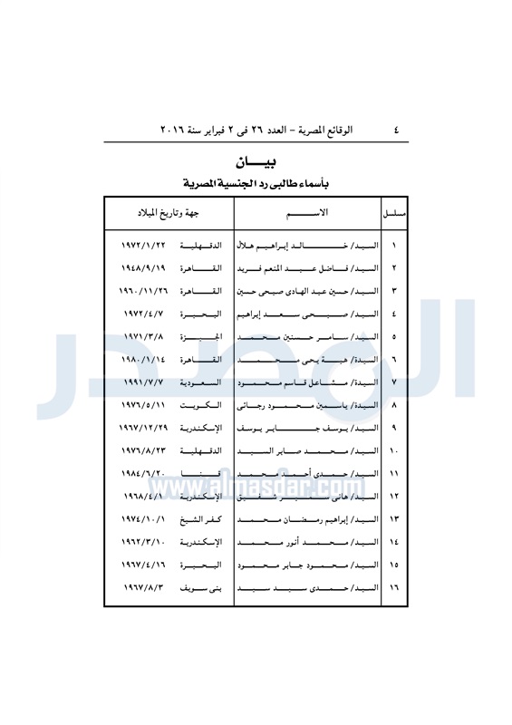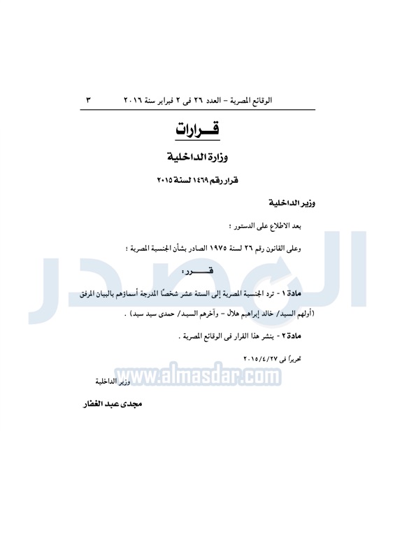 أخبار مصر وزارة الداخلية ترد الجنسية المصرية إلي 16 شخصًا الثلاثاء 02 فبراير 2016 - 10:50 ص 2/2/2016 10:50:00 AM وزارة الداخلية - صورة أرشيفية المصدر - خاص طباعة شارك نشرت الوقائع المصرية فى العدد رقم 26، الصادر في 2 فبراير لسنة 2016، وزارة الداخلية قرار رقم 1469 لسنة 2015، بشأن رد الجنسية إلي 16 شخصًا.لقراءة القرار: طباعة شارك وزارة الداخلية الوقائع المصرية الجنسية المصرية أخبار مصر تابع المصدر علي جوجل نيوز تطبيق نبض