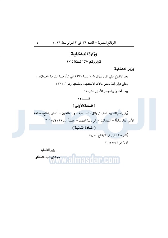 أخبار مصر وزير الداخلية يقرر ترقية اسم الشهيد وائل طاحون الثلاثاء 02 فبراير 2016 - 11:07 ص 2/2/2016 11:07:48 AM وزارة الداخلية - صورة أرشيفية المصدر - خاص طباعة شارك نشرت الوقائع المصرية فى العدد رقم 26، الصادر في 2 فبراير لسنة 2016، قرار وزارة الداخلية رقم 1570 لسنة 2015، بشأن ترقية اسم الشهيد العقيد وائل عاطف عبد المجيد طاحون.لقراءة القرار: طباعة شارك وزارة الداخلية وائل طاحون مصر مجدي عبد الغفار الوقائع المصرية تابع المصدر علي جوجل نيوز تطبيق نبض