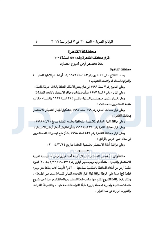 عقارات "الوقائع المصرية" تنشر قرار تخصيص قطعة أرض لمشروع استثماري بالقاهرة الأحد 07 فبراير 2016 - 03:47 م 2/7/2016 3:47:00 PM عبد الرحيم شحاتة محافظ القاهرة الأسبق المصدر - خاص طباعة شارك نشرت الوقائع المصرية فى العدد رقم 30، الصادر في 7 فبراير لسنة 2016، قرار محافظة القاهرة، رقم 1571 لسنة 2004، بشأن تخصيص أرض لمشروع استثماري. لقراءة القرار: طباعة شارك محافظة القاهرة محافظ القاهرة جلال مصطفى السعيد تخصيص قطعه ارض الوقائع المصرية الإستثمار تابع المصدر علي جوجل نيوز تطبيق نبض