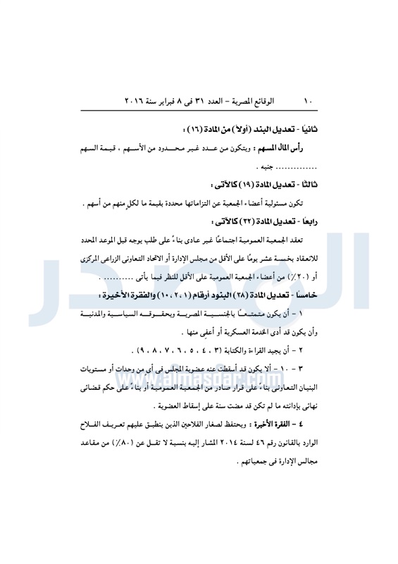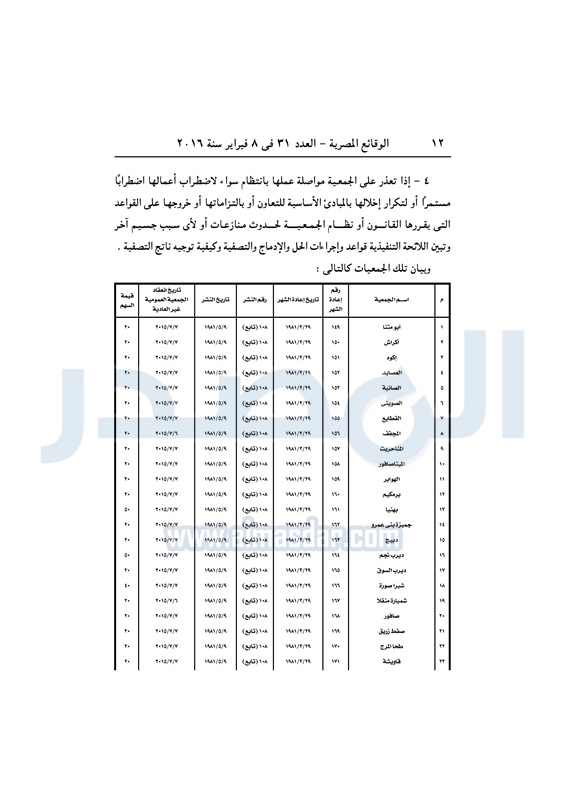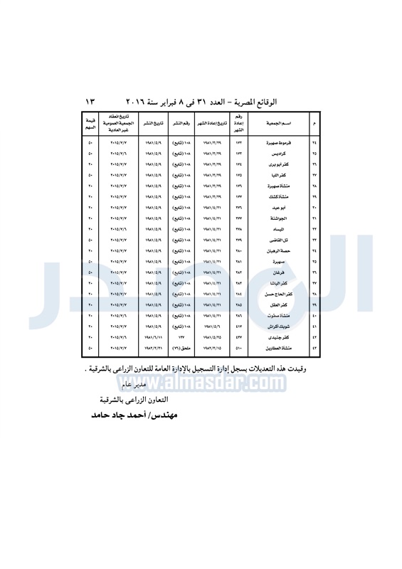 محافظات مديرية الزراعة بالشرقية تصدر قرارات الجمعيات العمومية الإثنين 08 فبراير 2016 - 11:57 ص 2/8/2016 11:57:36 AM ديوان محافظة الشرقية - صورة أرشيفية المصدر - خاص طباعة شارك نشرت الوقائع المصرية فى العدد رقم 31، الصادر في 8 فبراير لسنة 2016، ملخص قرارات الجمعيات العمومية غير العادية لبعض الجمعيات التابعة لمديرية الزراعة بالشرقية.لقراءة القرار: طباعة شارك محافظة الشرقية الوقائع المصرية الزراعة الجمعيات العمومية اخبار محافظة الشرقية تابع المصدر علي جوجل نيوز تطبيق نبض