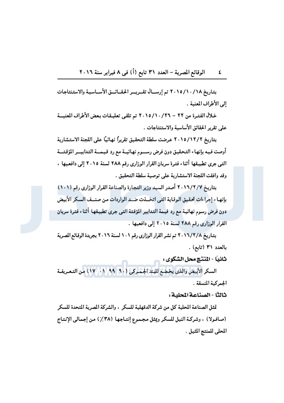 نشرت الوقائع المصرية فى العدد رقم 31 تابع أ، الصادر في 8 فبراير لسنة 2016، إعلان وزارة التجارة والصناعة، رقم 2 لسنة 2016، بشأن إنهاء تحقيق الوقاية ضد الواردات من صنف السكر الأبيض، حيث توصلت سلطة التحقيق إلى عدم توافر الضرر الجسيم الوارد بنص المادة 4-1 (أ) من اتفاق الوقاية.