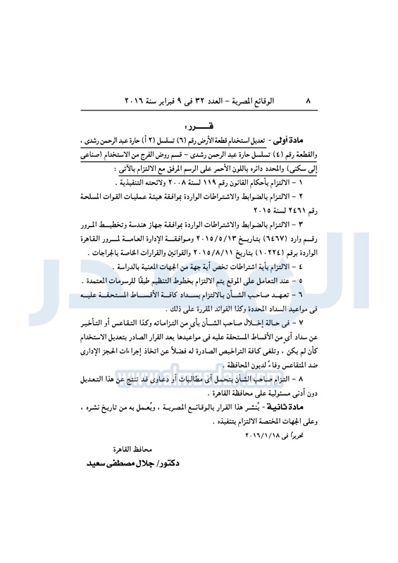 محافظات محافظ القاهرة يقرر تعديل استخدام أراضٍ بروض الفرج الثلاثاء 09 فبراير 2016 - 02:46 م 2/9/2016 2:46:49 PM جلال مصطفى سعيد محافظ القاهرة المصدر - خاص طباعة شارك نشرت الوقائع المصرية فى العدد رقم 32، الصادر في 9 فبراير لسنة 2016، قرار محافظ القاهرة، رقم 251 لسنة 2016، بشأن تعديل استخدام قطعتي أرض تابعتان لقسم روض الفرج. لقراءة القرار: طباعة شارك محافظ القاهرة جلال مصطفى السعيد الوقائع المصرية اخبار محافظة القاهرة تابع المصدر علي جوجل نيوز تطبيق نبض