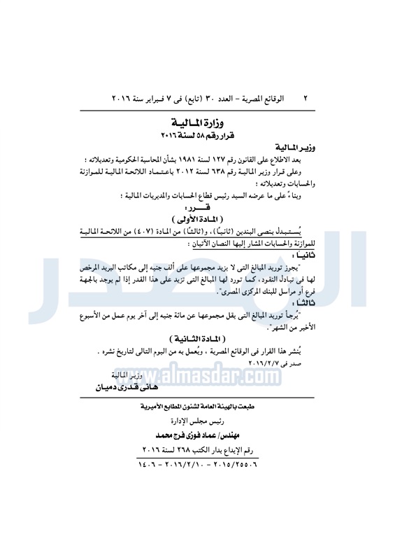 نشرت الوقائع المصرية فى العدد 30 تابع، الصادر في 7 فبراير لسنة 2016، قرار وزارة المالية، رقم 58 لسنة 2016، بشأن استبدال بندين من المادة 407 من اللائحة المالية للموازنة والحسابات.