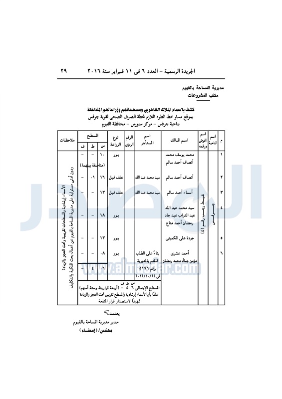 نشرت الجريدة الرسمية فى العدد 6، الصادر في 11 فبراير لسنة 2016، قرار رئيس جمهورية مصر العربية، رقم 10 لسنة 2016، بشأن اعتبار مشروع اقامة خط الطرد لمحطة الصرف الصحي، بالفيوم من أعمال المنفعة العامة.