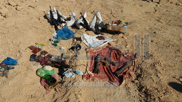وقال العميد محمد سمير المتحدث العسكري، إن قوات الجيش الثالث الميدانى تمكنت من ضبط مخزنين للأسلحة والذخائر خاصين بالعناصر الإرهابية أحدهما بمنطقة وادى الفهد جنوب شرق جبل الخرم، عثر بداخله على عدد 5 أجولة من مادة "C4" التى تستخدم فى تصنيع العبوات الناسفة بإجمالى وزن "125" كجم، وعدد "7" قوالب من مادة TNT شديدة الإنفجار، ومجموعة من الأدوات التى تستخدم فى تصنيع العبوات الناسفة، وعدد "2" بومبة هاون، وعدد "132" طلقة مختلفة الأعيرة، وعدد "2" بندقية آلية، وبندقية قناصة ورشاش، وعدد "3" خزنة بندقية آلية، وعدد "2" خزنة رشاش، وخزنة بندقية قناصة.
