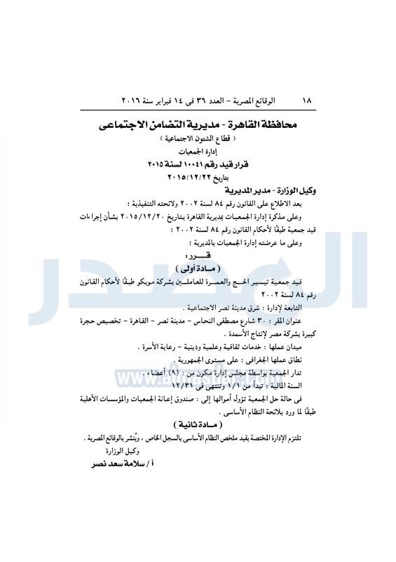 محافظات "التضامن الاجتماعي" بالقاهرة تقيد جمعية تيسير الحج والعمرة الأحد 14 فبراير 2016 - 02:41 م 2/14/2016 2:41:19 PM وزارة التضامن الاجتماعي - صورة أرشيفية المصدر - خاص طباعة شارك نشرت الوقائع المصرية فى العدد 36، الصادر في 14 فبراير لسنة 2016، قرار مديرية التضامن الاجتماعي بالقاهرة، بشأن قيد جمعية تيسير الحج والعمرة للعاملين بشركة مويكو. لقراءة القرار: طباعة شارك محافظة القاهرة جمعيات خيرية الوقائع المصرية الصندوق الاجتماعي تابع المصدر علي جوجل نيوز تطبيق نبض