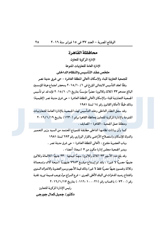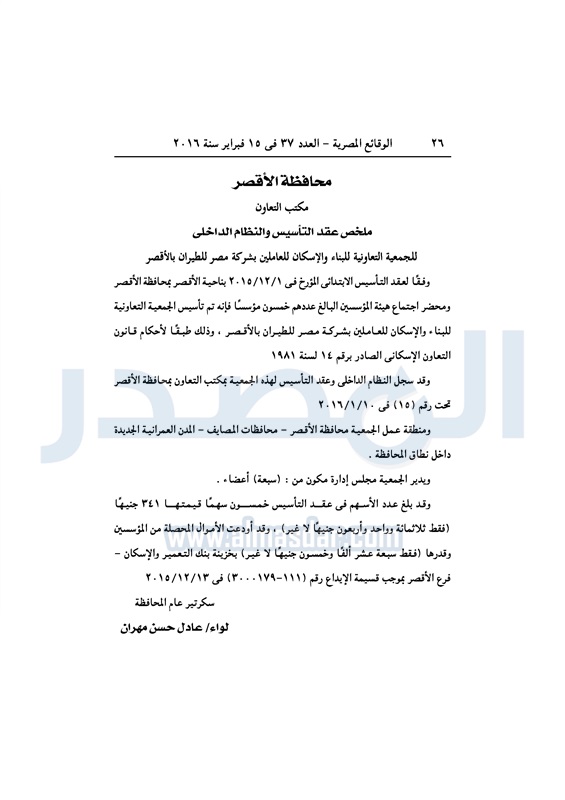 محافظات "الوقائع المصرية" تنشر ملخصات عقد التأسيس لـ "البناء والإسكان" الإثنين 15 فبراير 2016 - 11:54 ص 2/15/2016 11:54:16 AM ديوان محافظة الأقصر - صورة أرشيفية المصدر - خاص طباعة شارك نشرت الوقائع المصرية فى العدد 37، الصادر في 15 فبراير لسنة 2016، ملخصات عقد التأسيس للجمعية التعاونية للبناء والإسكان بالقاهرة والأقصر.لقراءة القرار: طباعة شارك الوقائع المصرية القاهرة الجمعية التعاونية الأقصر الإسكان تابع المصدر علي جوجل نيوز تطبيق نبض