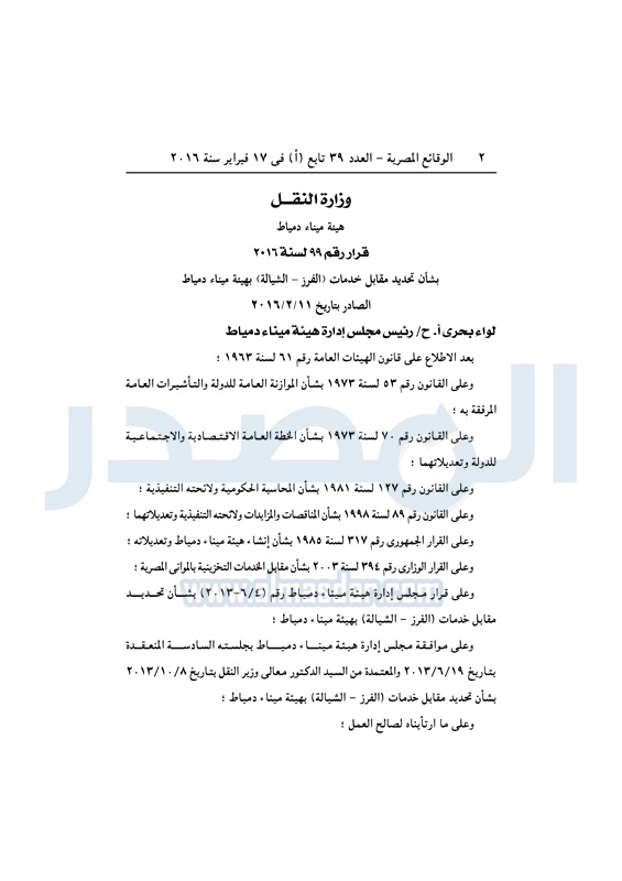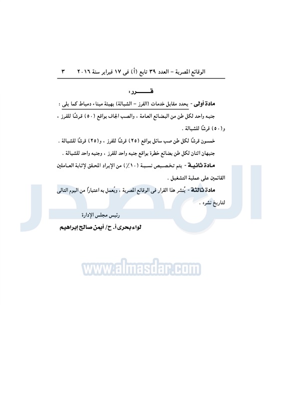 أسواق "هيئة ميناء دمياط" تحدد مقابل خدمات "الفرز- الشيالة" الخميس 18 فبراير 2016 - 03:04 م 2/18/2016 3:04:00 PM ميناء دمياط - صورة أرشيفية المصدر - خاص طباعة شارك نشرت الوقائع المصرية فى العدد 39 تابع (أ)، الصادر في 17 فبراير لسنة 2016، قرار هيئة ميناء دمياط، رقم 99 لسنة 2016، بشأن تحديد مقابل خدمات "الفرز-الشيالة" بالميناء.لقراءة القرار: طباعة شارك ميناء دمياط دمياط الوقائع المصرية الشيالة تابع المصدر علي جوجل نيوز تطبيق نبض