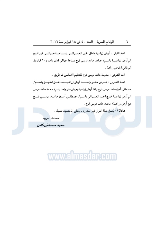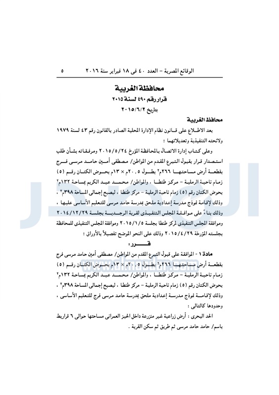 محافظات محافظ "الغربية" يقبل تبرع مواطن بقطعة أرض لبناء مدرسة إعدادية الخميس 18 فبراير 2016 - 03:16 م 2/18/2016 3:16:23 PM ديوان محافظة الغربية - صورة أرشيفية المصدر - خاص طباعة شارك نشرت الوقائع المصرية فى العدد 40، الصادر في 18 فبراير لسنة 2016، قرار محافظ القاهرة، رقم 490 لسنة 2015، بشأن الموافقة على قبول التبرع المقدم من مواطن بقطعة أرض.لقراءة القرار: طباعة شارك محافظة الغربية محافظ الغربية الوقائع المصرية الغربية تابع المصدر علي جوجل نيوز تطبيق نبض