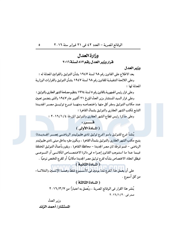 نشرت الوقائع المصرية في العدد رقم 42، الصادر في 21 فبراير 2016، قرار وزير العدل، رقم 813 لسنة 2016 بشأن إنشاء فرع للتوثيق باسم فرع هليوليدور الرياضى بمصر الجديدة.