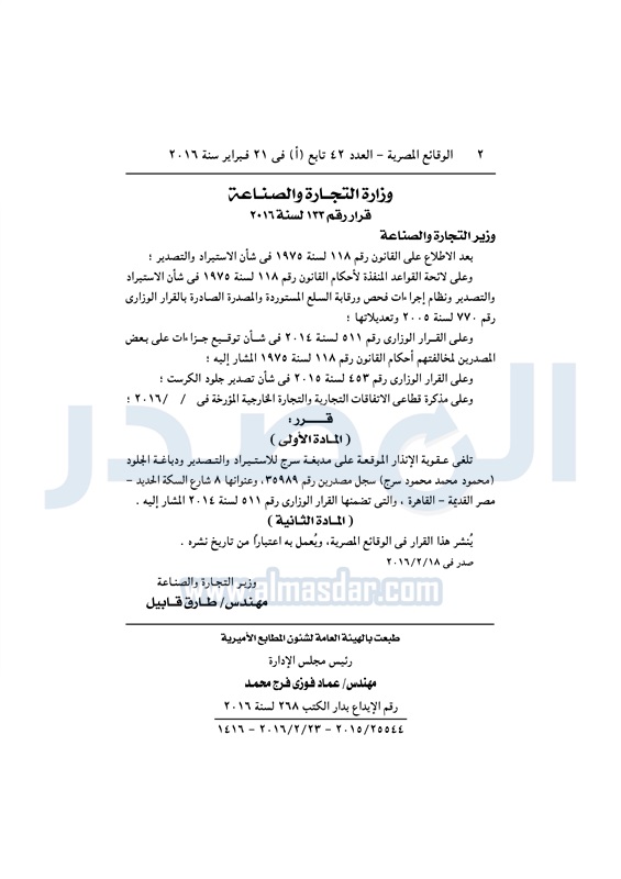 نشرت الوقائع المصرية في العدد رقم 42 تابع "أ"، الصادر في 21 فبراير 2016، قرار وزارة التجارة والصناعة، رقم 133 لسنة 2016، بشأن إلغاء عقوبة الإنذار الموقعة على مدبغة سرج للإستيراد والتصدير ودباغة الجلود .