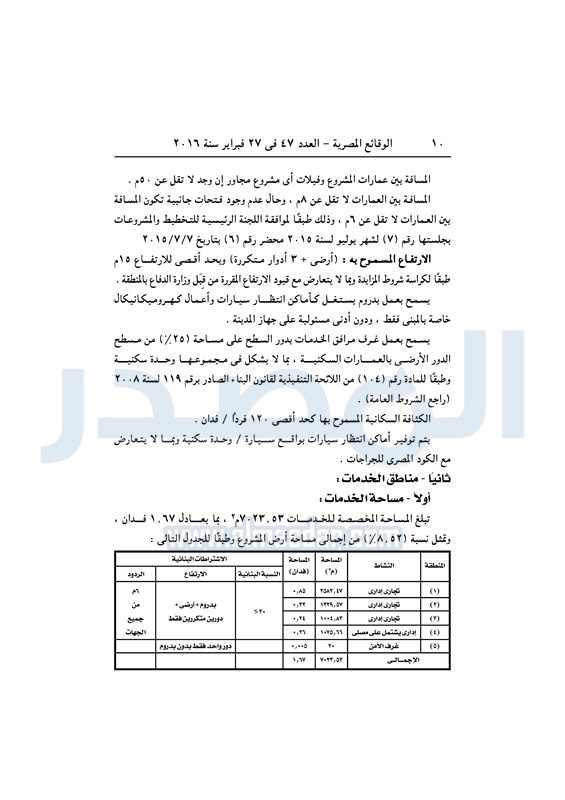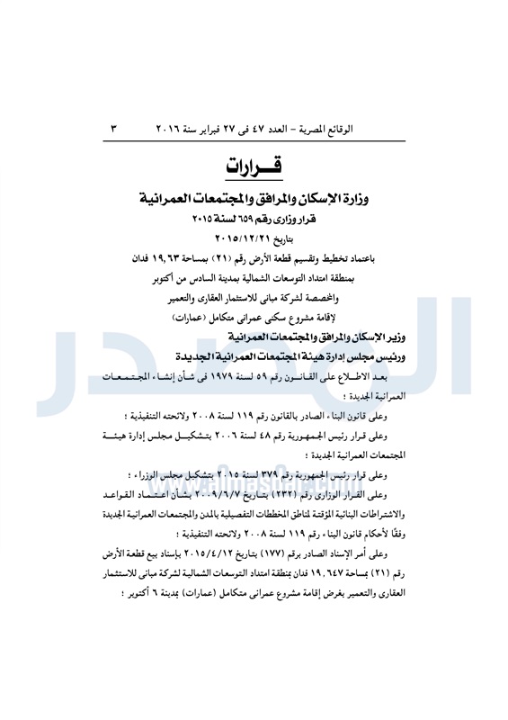 نشرت الوقائع المصرية في العدد رقم 47، الصادر في 24 فبراير 2016، قرار وزارة الإسكان والمرافق والمجتمعات العمرانية، رقم 659 لسنة 2015، بشأن اعتماد وتخطيط وتقسيم قطعة أرض بمدينة السادس من أكتوبر.