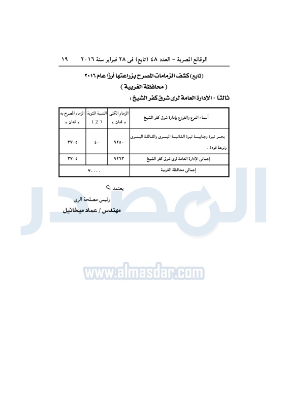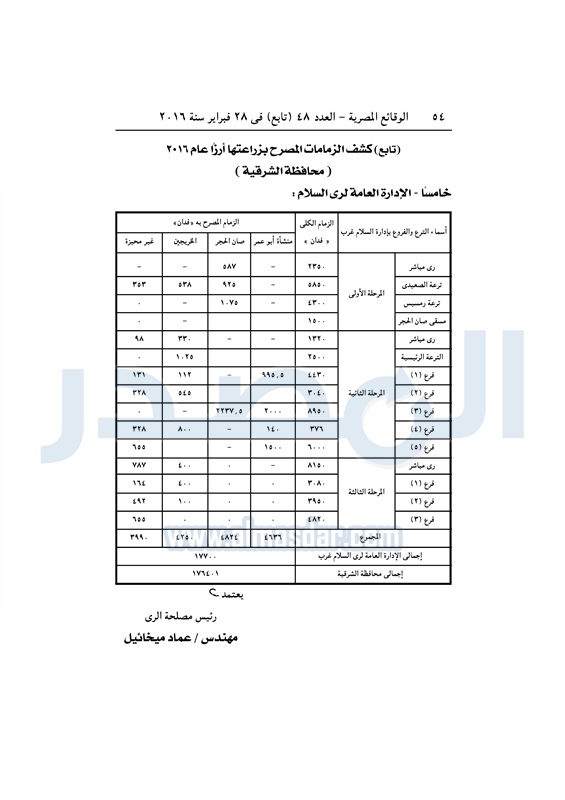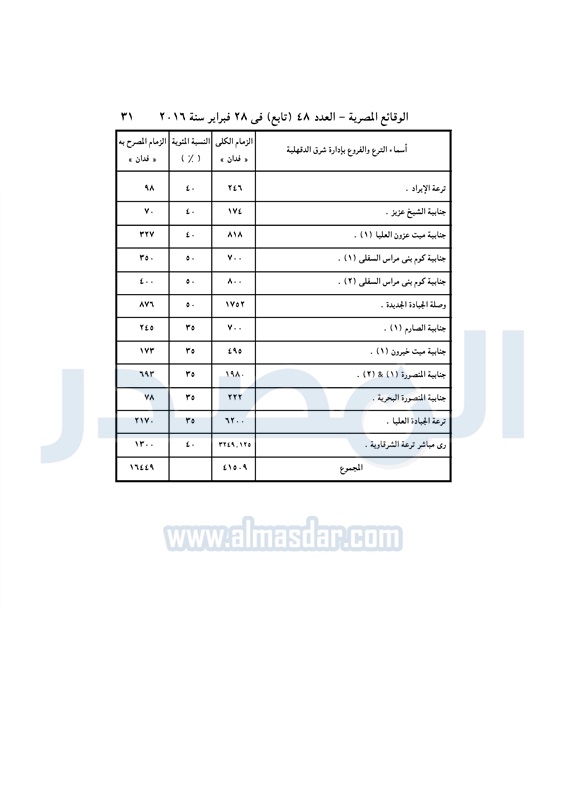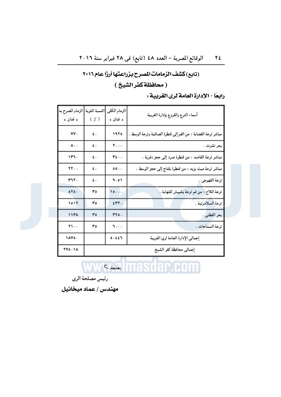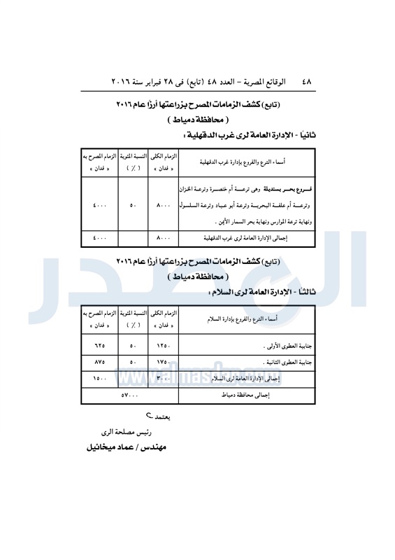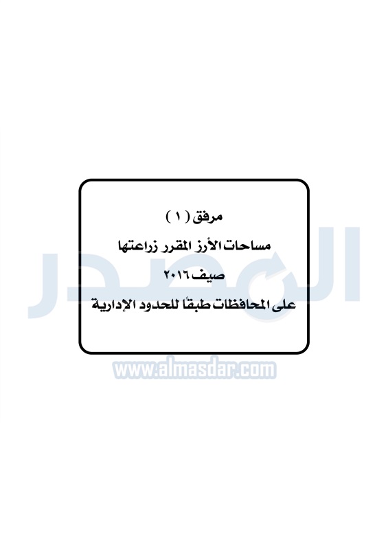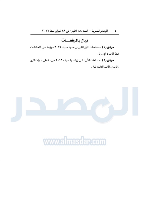 نشرت الوقائع المصرية، في العدد رقم 48 "تابع"، الصادر في 28 فبراير 2016، قرار وزارة الموارد المائية والري، رقم 229 لسنة 2016، بشأن تحديد مناطق ومساحات زراعة الأرز ببعض المحافظات.