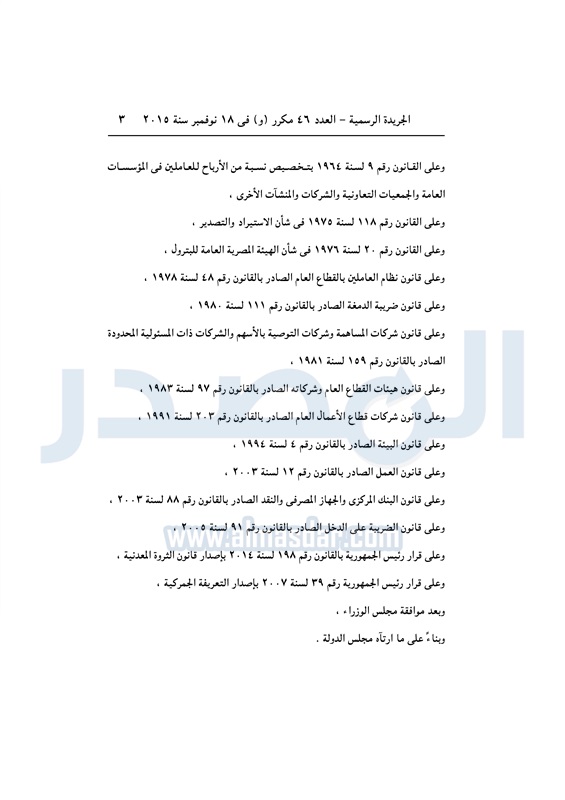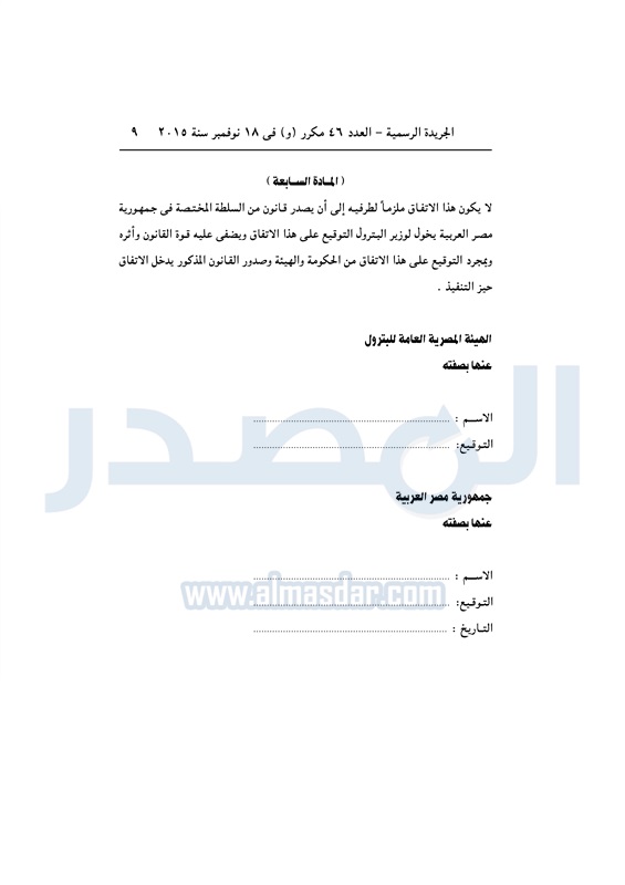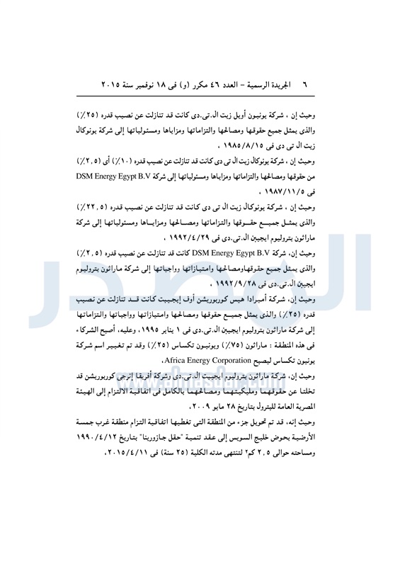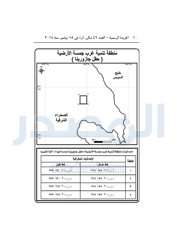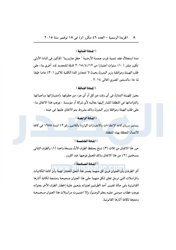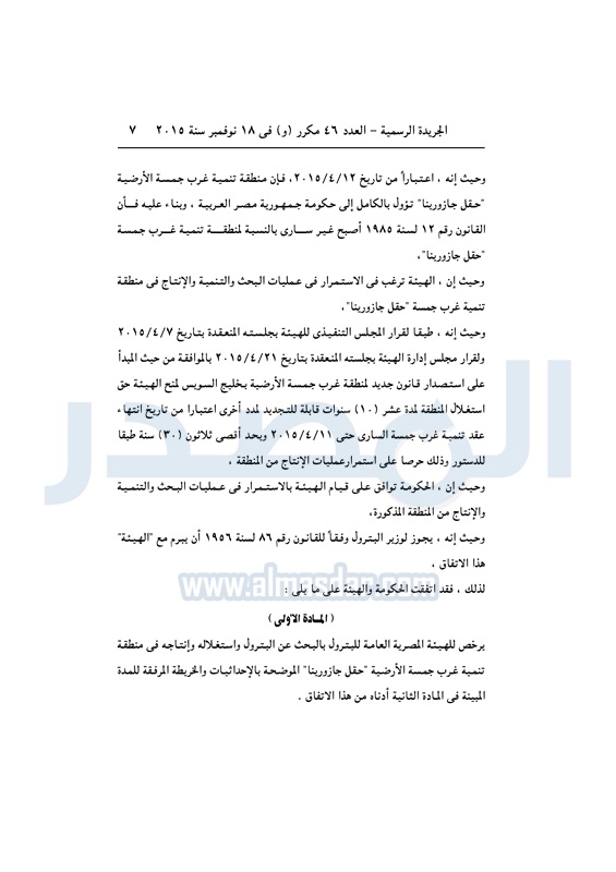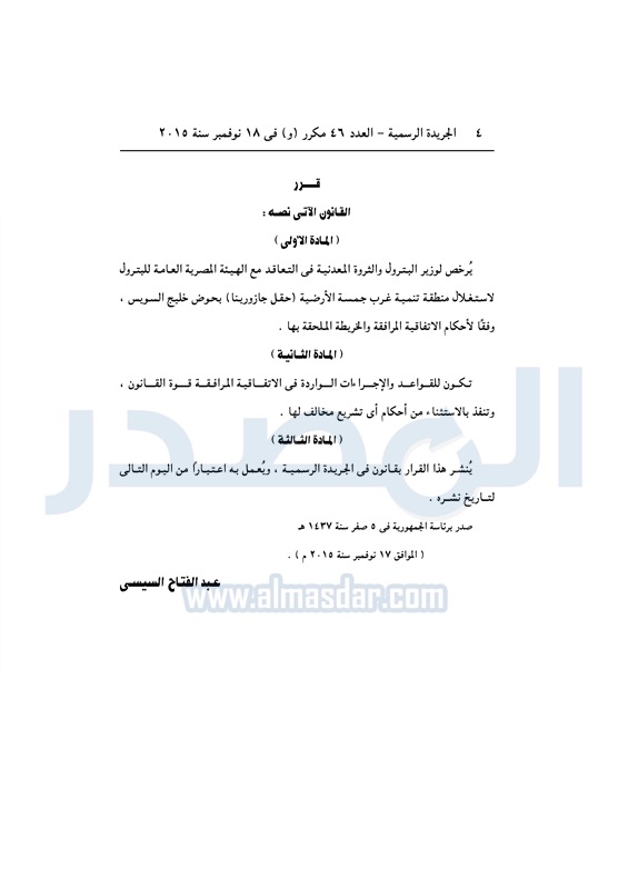 نشرت الجريدة الرسمية، في العدد 46 مكرر "و"، الصادر في 18 نوفمبر 2015، قرار رئيس الجمهورية، بالقانون رقم 116 لسنة 2015، بشأن الترخيص لوزير البترول والثروة المعدنية، في التعاقد مع الهيئة المصرية للبترول لاستغلال منطقة تنمية غرب جسمة الأرضية "حقل جازورينا" بحوض خليج السويس.